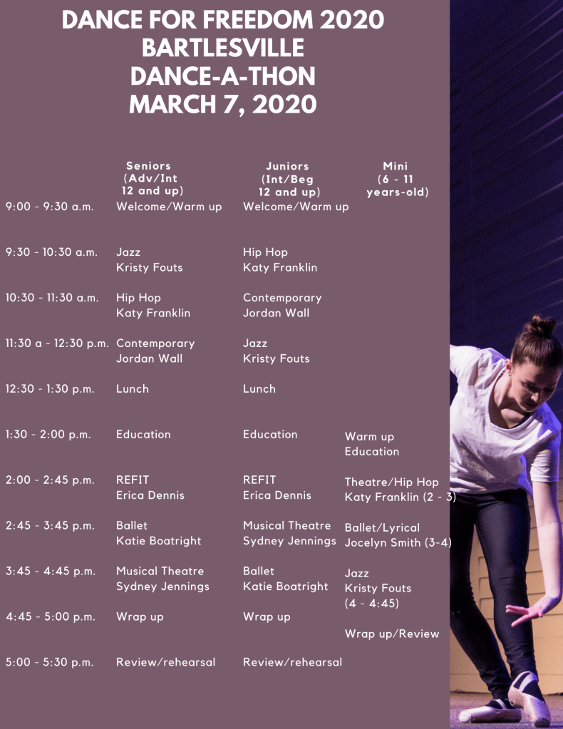 General Dance-a-thon Information:-9:00 a.m. – 5:30 p.m. (with an hour-long lunch break)